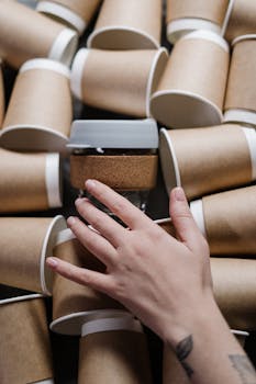 Eco-friendly paper cups with a hand reaching for a reusable coffee cup.